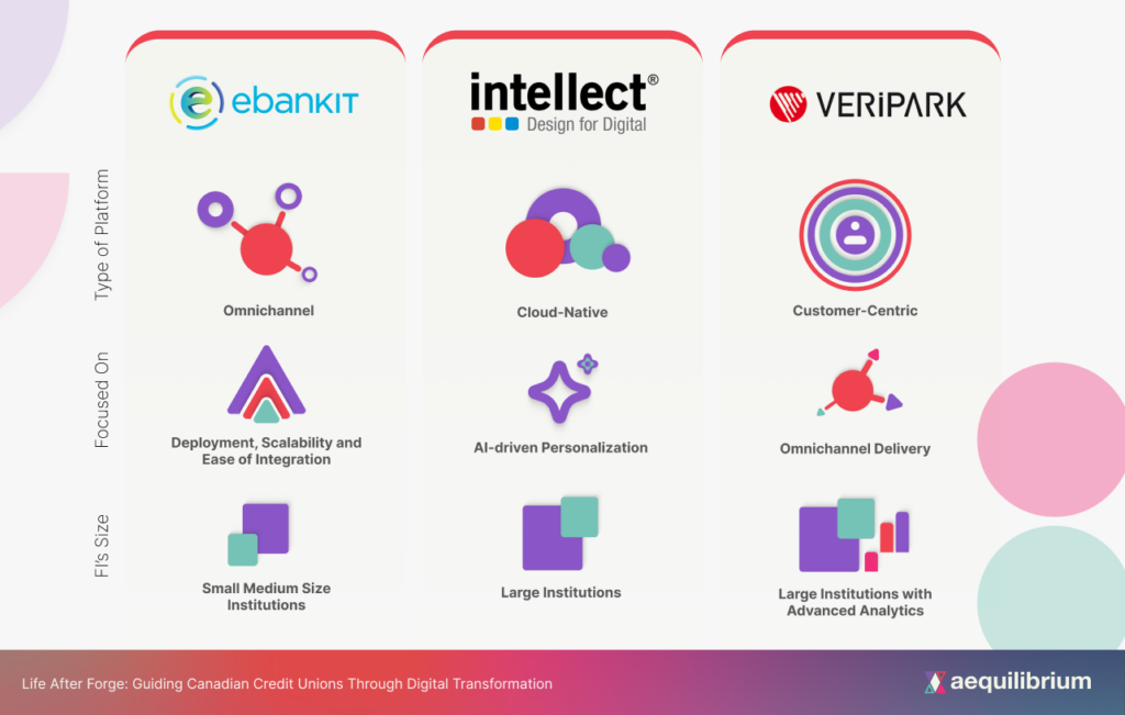 For example, when Central 1 launched Forge, champions like FirstWest, Alterna, and FirstOntario led the way. However, the landscape has shifted: Alterna transitioned to eBankIT two years ago, and FirstWest and FirstOntario have recently announced partnerships with VeriPark and Temenos, respectively. These shifts underscore the importance of a strategic approach to DBP selection, which considers features and the alignment of technology with the credit union’s unique needs and aspirations.