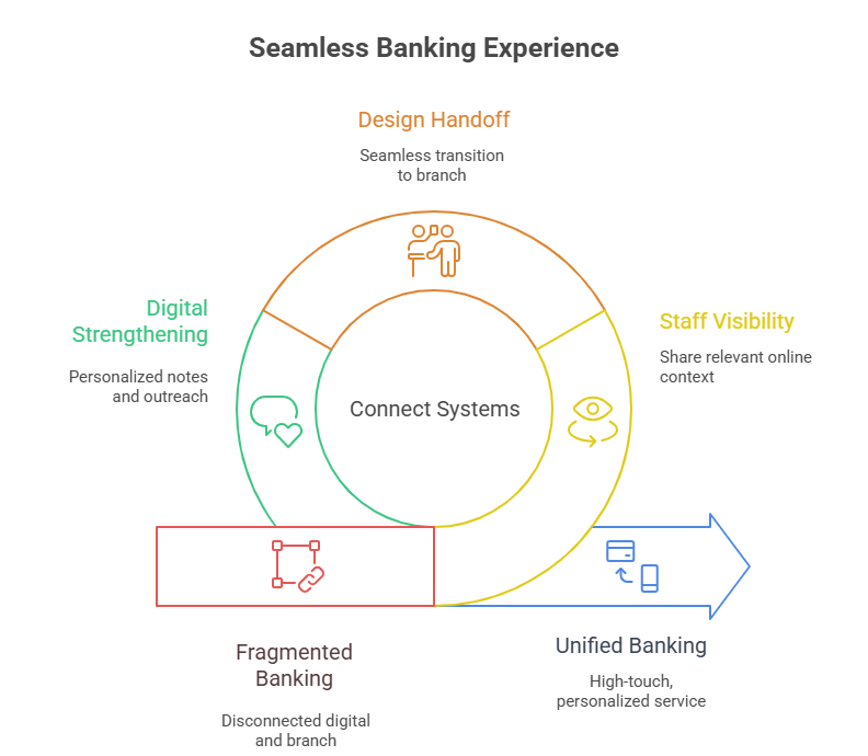 The branch becomes the high-touch channel for complex conversations, while digital handles routine needs. Both reinforce the same message: “We know you. We care about your success.”