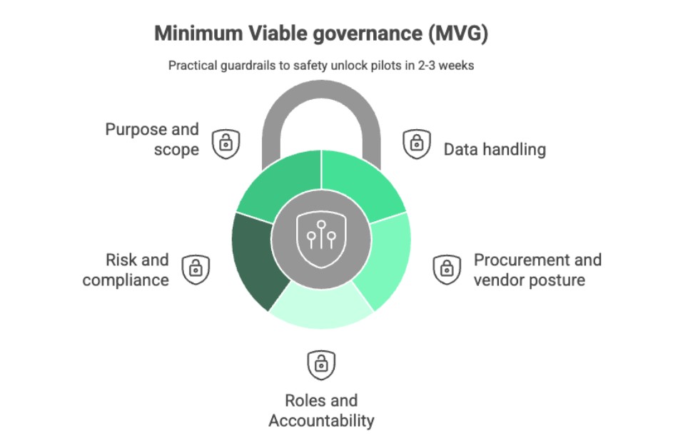 Before you pilot a single model, align on a simple, usable AI policy that your teams can actually follow. Treat this like a “MVG (Minimum Viable Governance)” layer that you can expand over time.